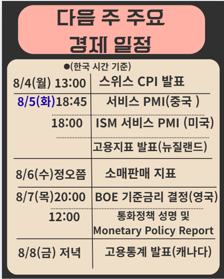 | 8월 5일(화) | 중국, 미국, 뉴질랜드 | 서비스 PMI / 고용지표 |